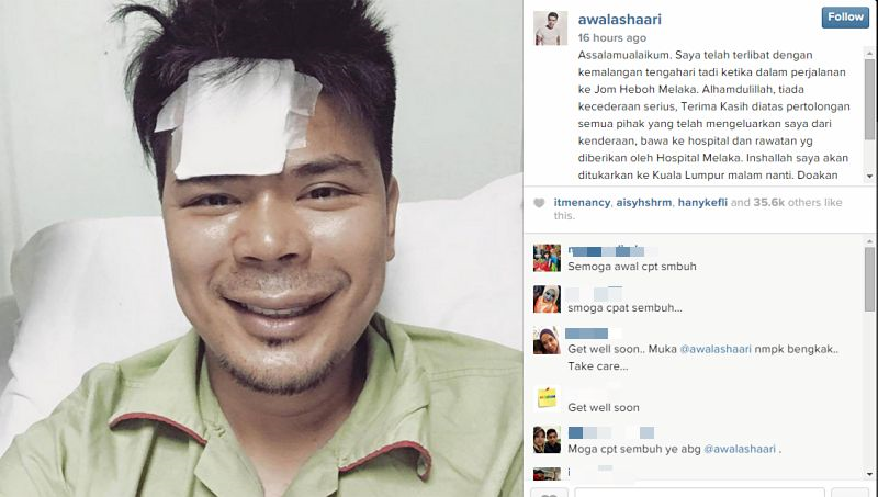 30032015 Awal Ashaari sempat selfie tanda sihat selepas kemalangan 30 March 2015 Dunia Artis Comments Off on Awal Ashaari sempat selfie tanda sihat selepas kemalangan 1128 Views Umum ketahui bahawa Awal Ashaari telah terlibat dalam sebuah kemalangan pada semalam hari ketika dalam perjalanan untuk mengacarakan program Melodi di Jom Heboh Melaka. Tweet terima kasih kepada pengunjung yang menghidupkan perkongsian ini. Kereta BMW 6 Series milik Awal Ashaari yang hilang kawalan dan rosak teruk akibat kemalangan itu.